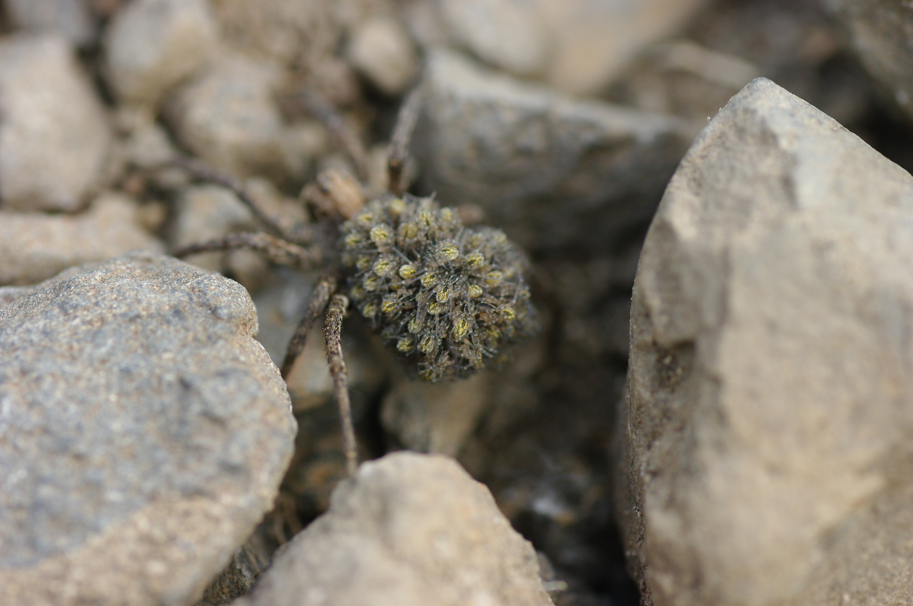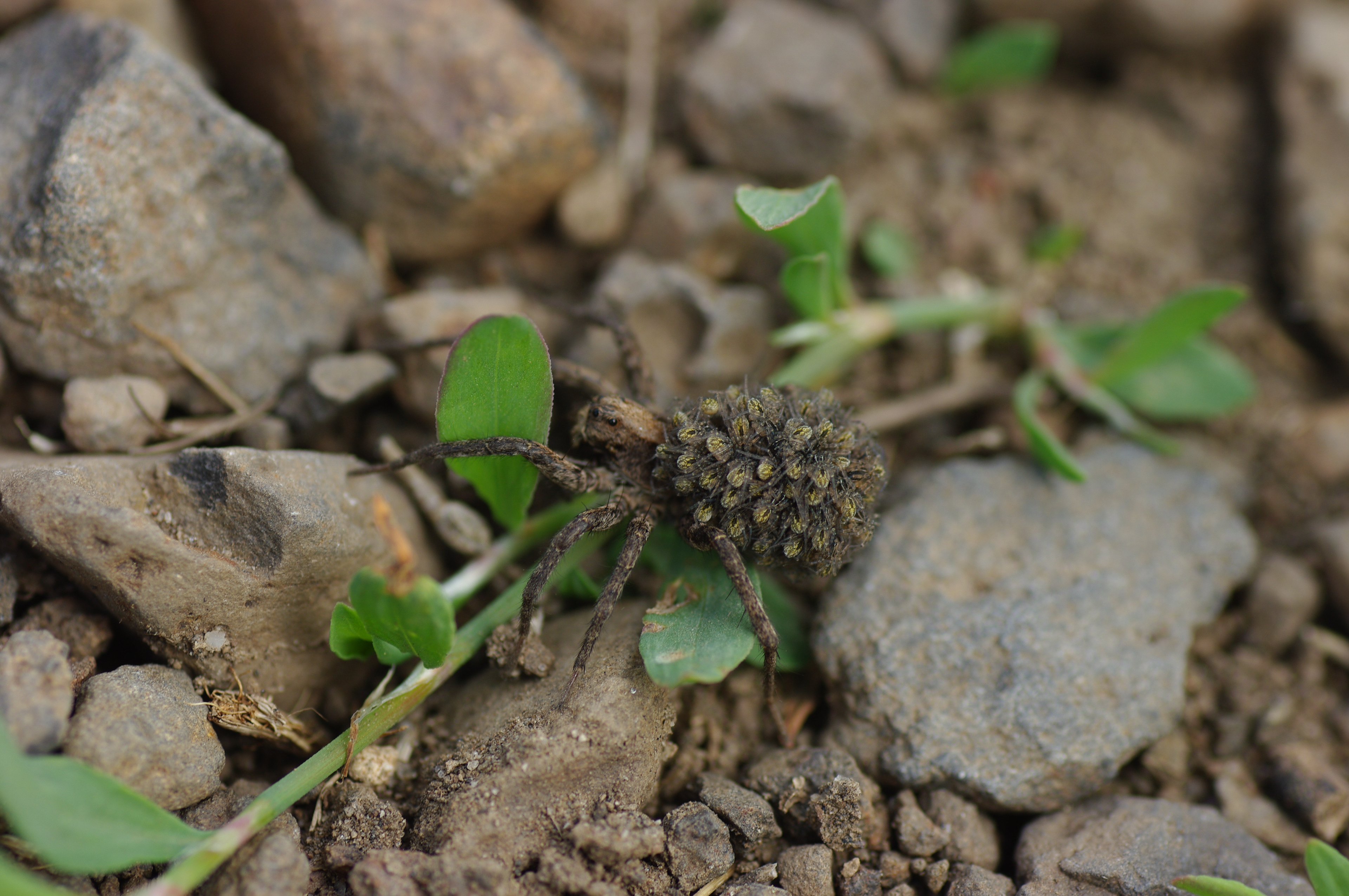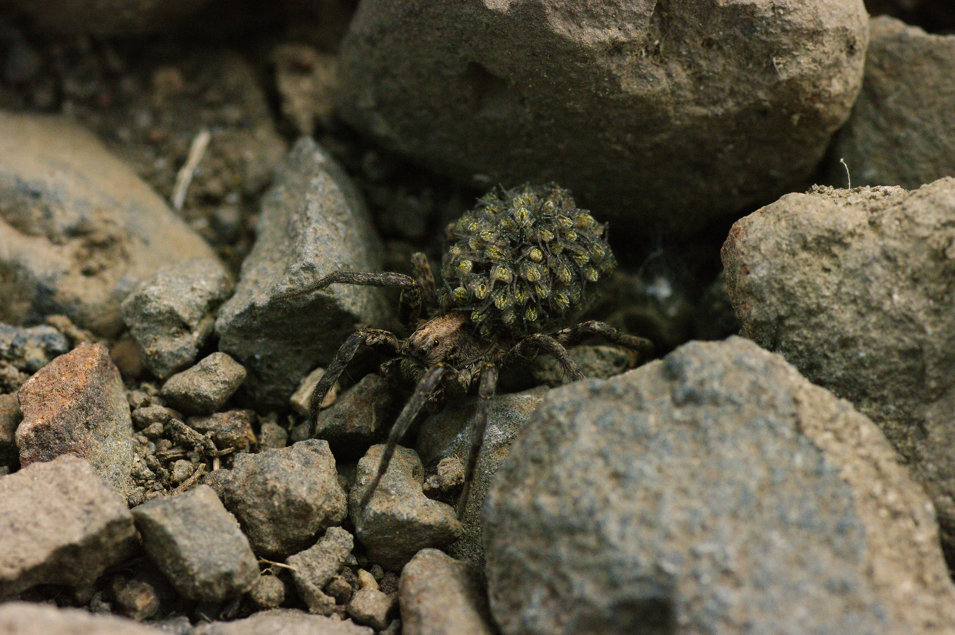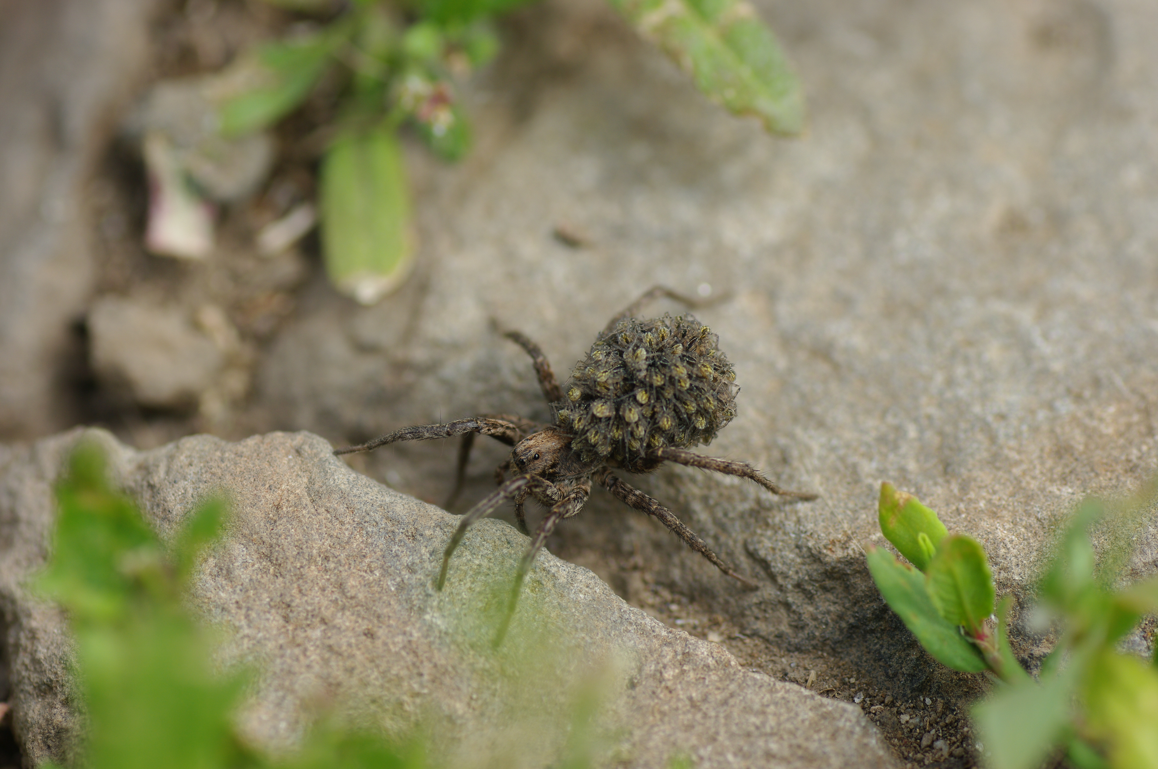 Mother spider crossing the trail with her little ones on a fine spring day.